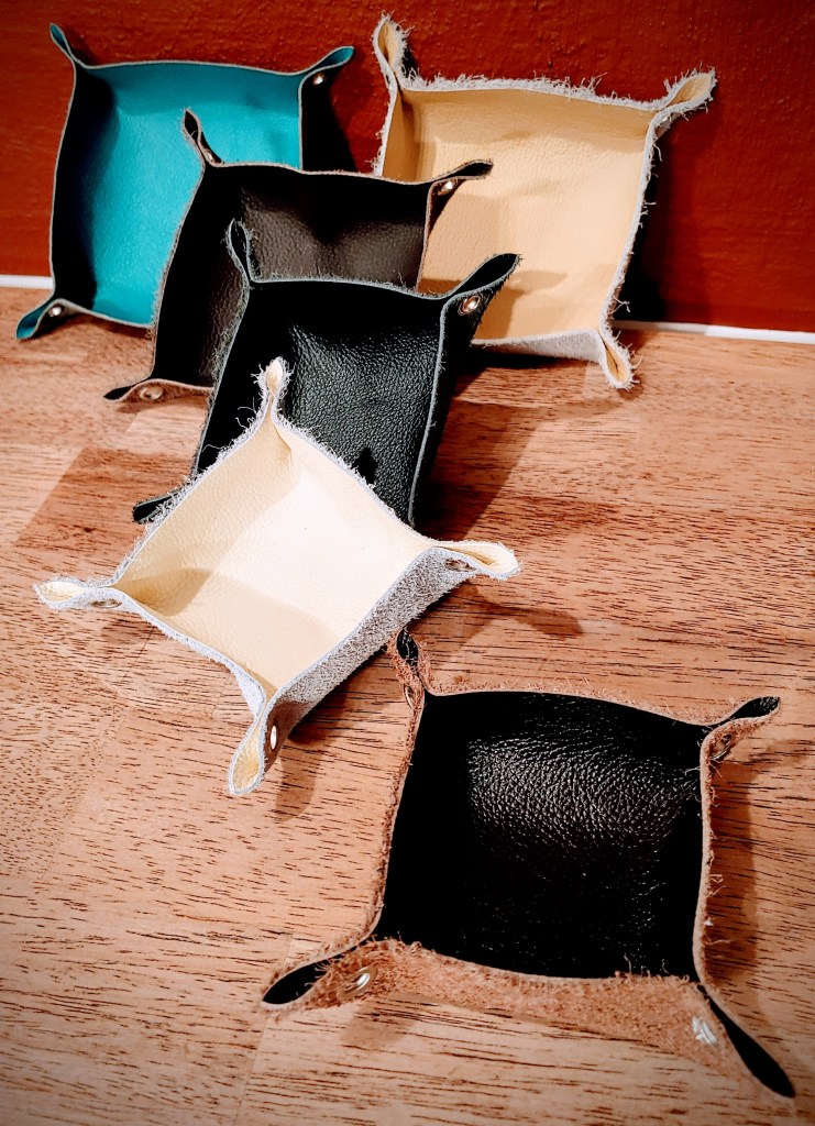 These leather trinket dishes are made from a variety of top grain and full grain leathers. These pieces have amazing textures and colors and give off a very organic feel.