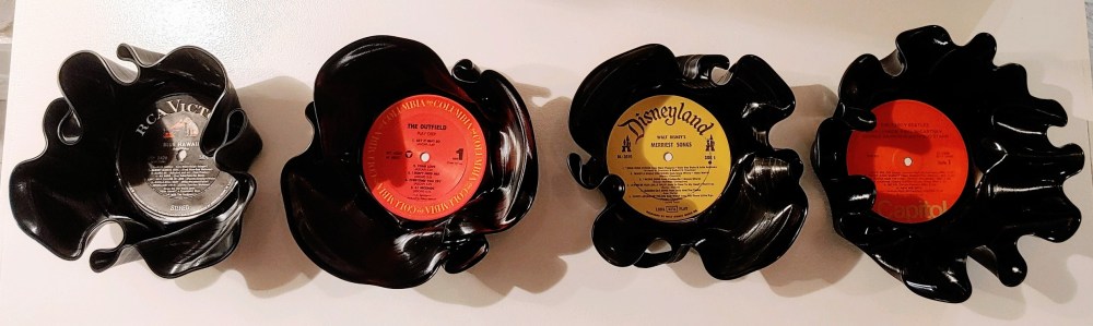 Vinyl record bowls are made from authentic vinyl records. Each bowl is individually made giving each one a unique design.
