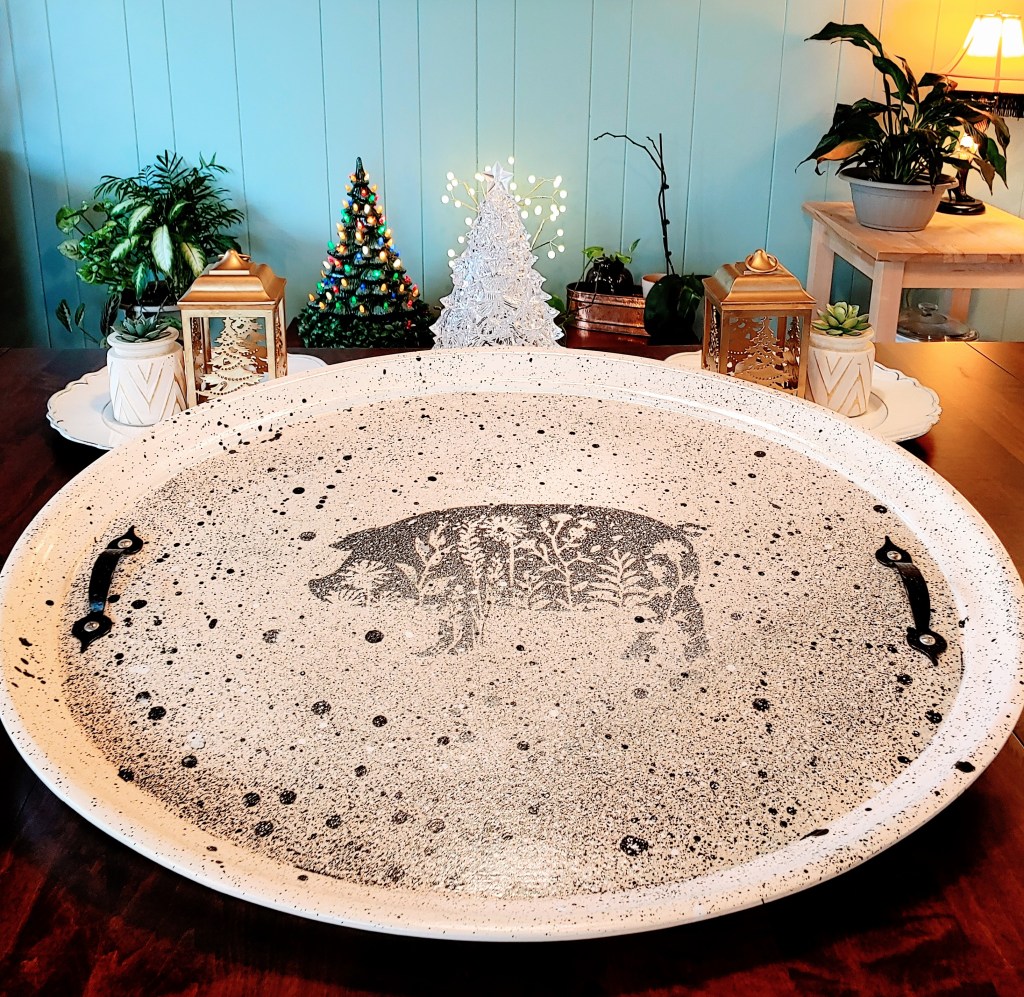 This elegant pig tray is one of a kind. This decorative tray features different painting techniques and speckled layers to give it extra depth and a unique look. Embellished with farmhouse style black handles.