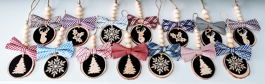 These rustic inspired Christmas ornaments are the perfect addition to your Christmas décor. Made with all natural wood slices and wooden beads. Garnished with a beautiful farmhouse style bow. Loops at the top make it easy to hang from Christmas tree branches or a door knob.